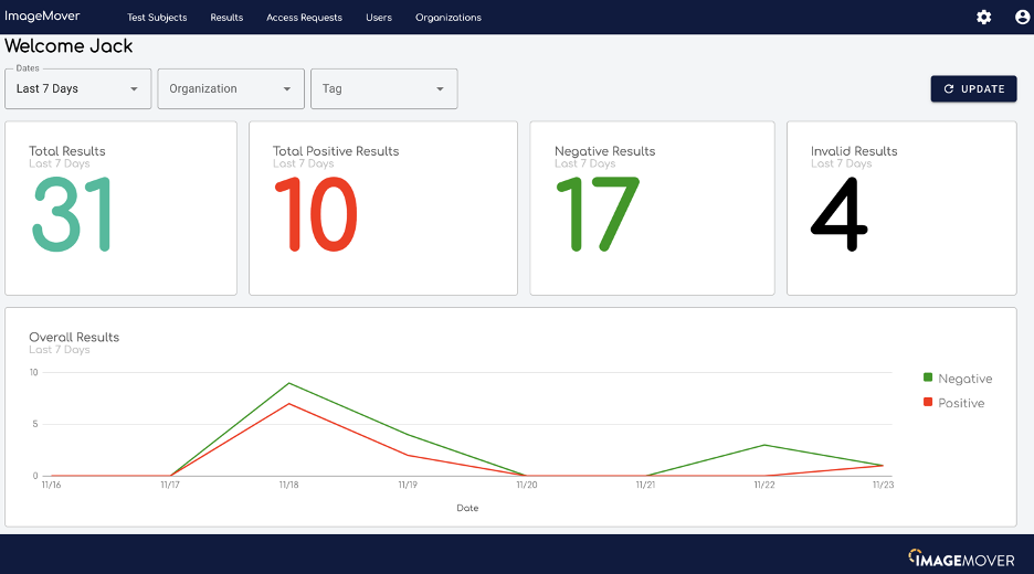 The ImageMover Web Portal is the portal for managing your organization’s test administration. The Web Portal is available to all users, and displays additional settings for administrators. There are seven main features in the Web Portal: Test Metric Dashboards, Test Subject Review, Test Result editing, Export Results, Access Requests, User Editing, and Organization Management.