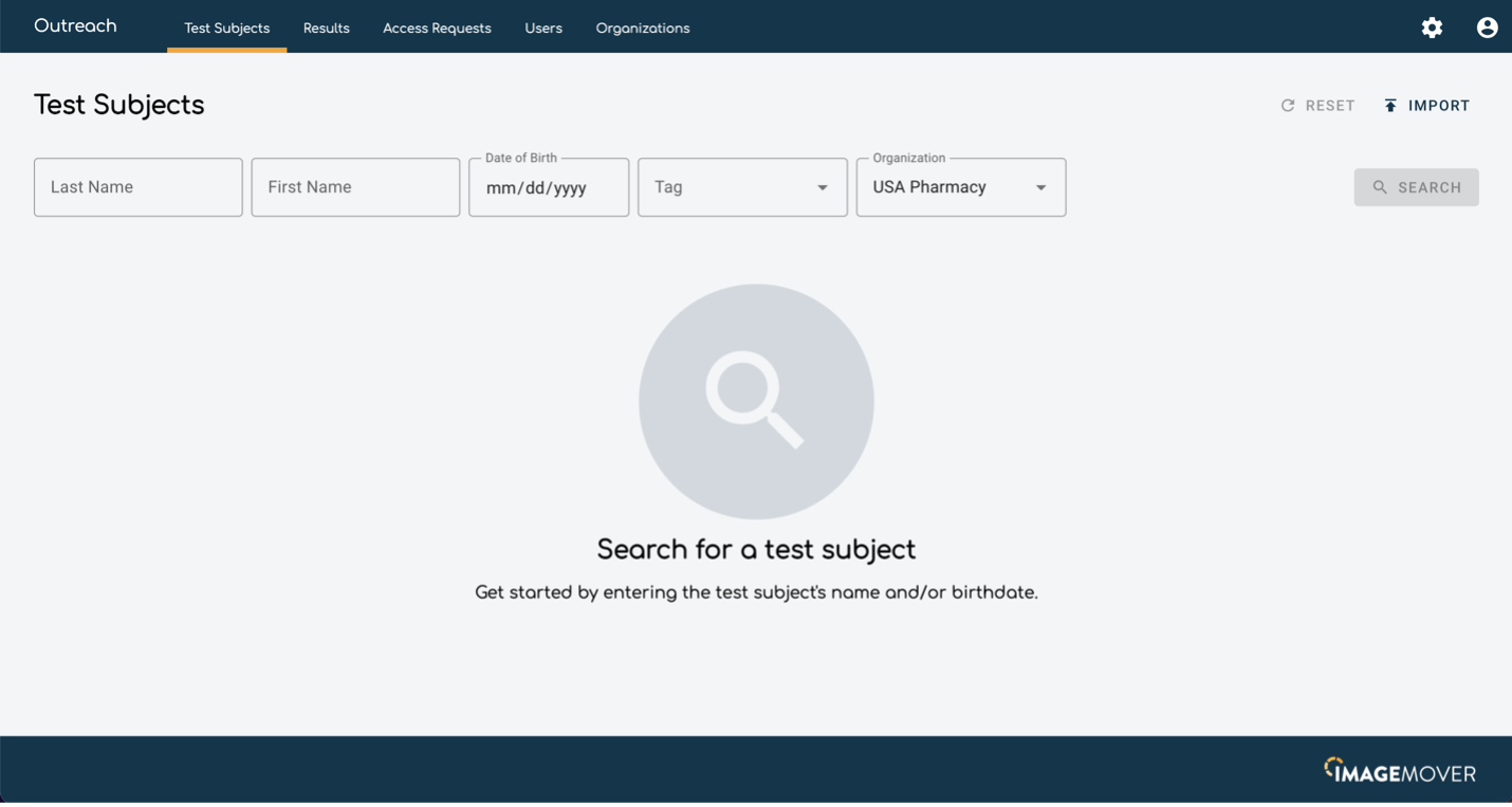 When navigating to the “Test Subjects” activity from the main navigation bar, we are brought to a search screen. Note that you must have either Organization Manager or Can Manage Test Subjects rights in order to access to access the Test Subjects activity.