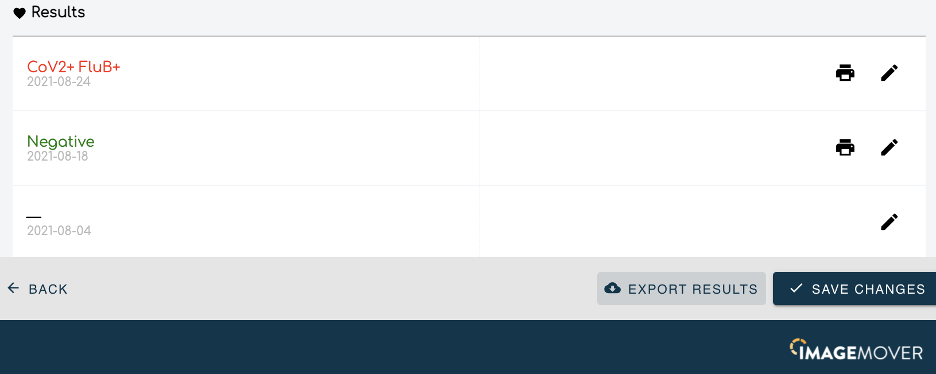 Within the edit Test Subject activity, you can see a list of their test results on the bottom portion of the screen. This high level view will show the date and the result of each test for the individual test subject.