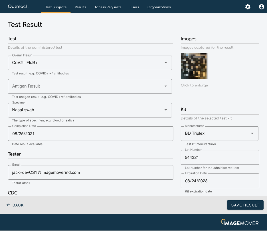 Clicking on the pencil icon for a specific test brings us to the Test Result edit activity. From here we can see all the detailed information associated with the test collection, including test kit details, recorded symptoms, attached images, locations, and performing tester. On the right hand side, you will see the photos attached to the result that you can click to expand.