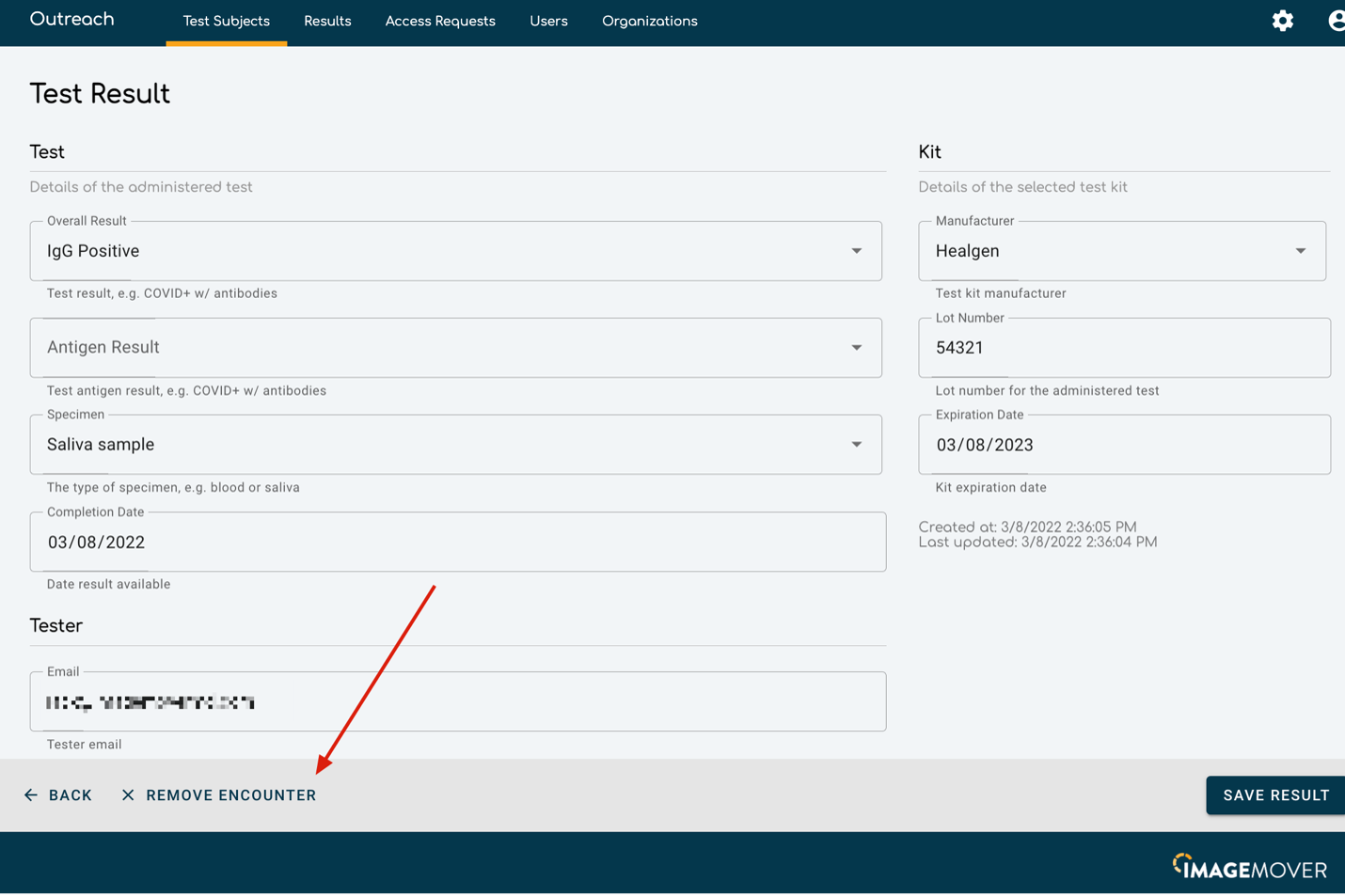 If you need to remove an entire test result, first navigate to the correct test subject via the test subject activity. Once you have clicked on the correct Test Subject, scroll down to the bottom and click on the pencil icon to edit the desired encounter. You can then find the Remove Encounter button. This action cannot be undone.