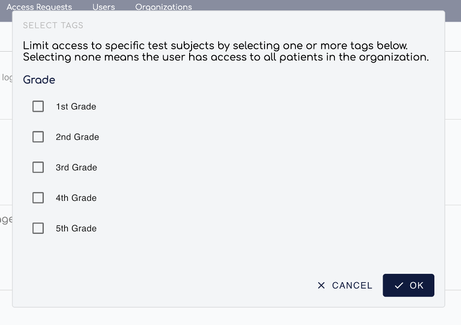 If you have tags configured at your organization, you can add additional restrictions about which test subjects a user can access by pressing Edit Tags. If none are selected, then the user has access to all test subjects in the organization.